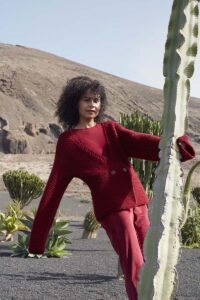 A double-breasted jacket knit in squishy garter stitch, FLAMING HUE envelopes you with warmth and style. The rhythmic undulation of the garter stitch, reminiscent of dancing flames, not only speaks to but also ignites the inner fire of your creativity, transforming each stitch into a vibrant expression as you breathe life into the embers of this project.