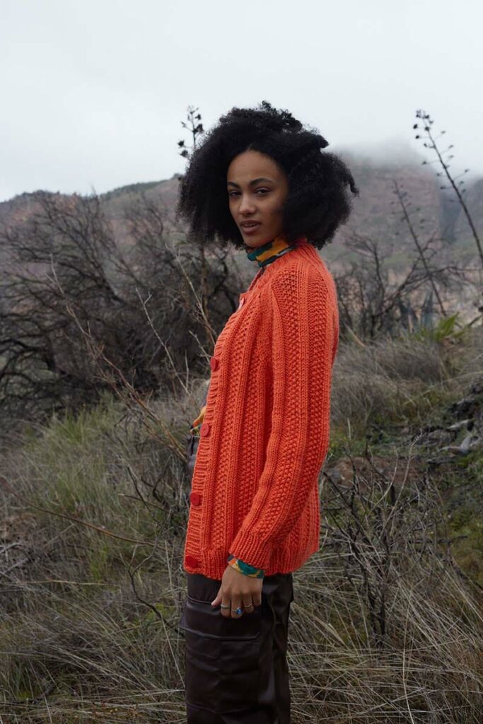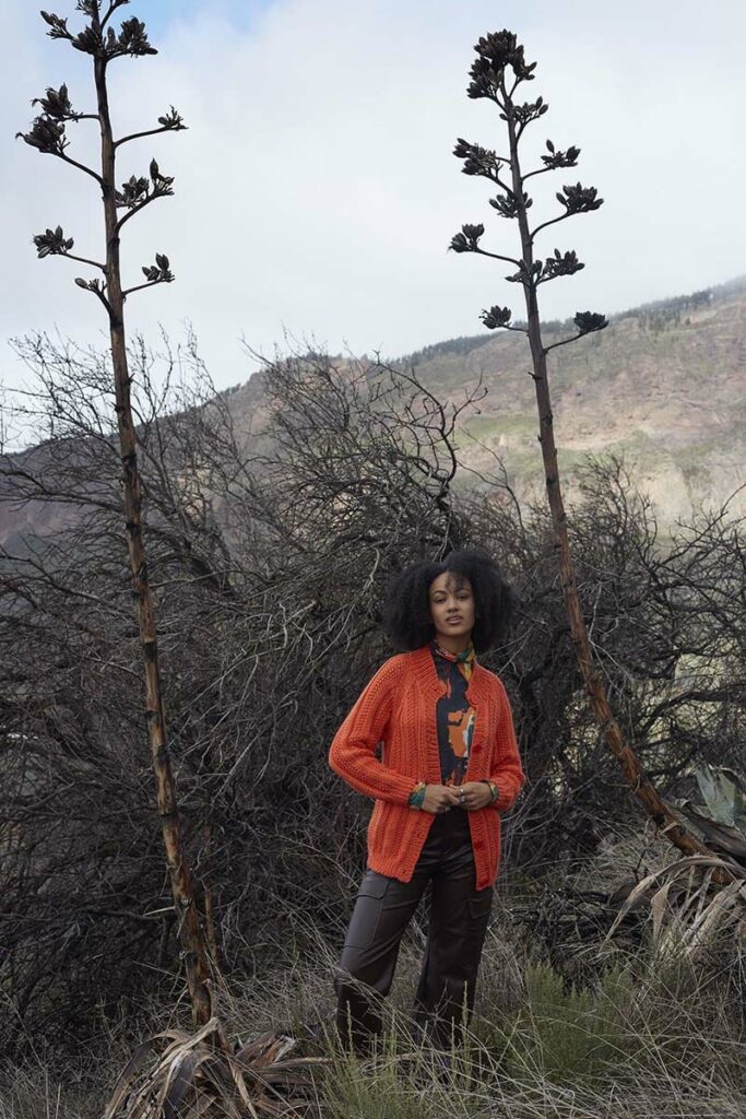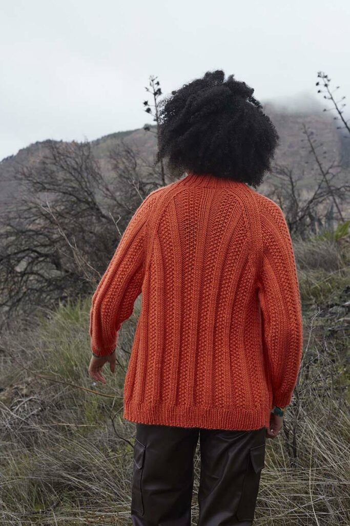 A beautiful, fitted cardigan with large buttons in partial fun moss stitch. Perfect for long days when going out.