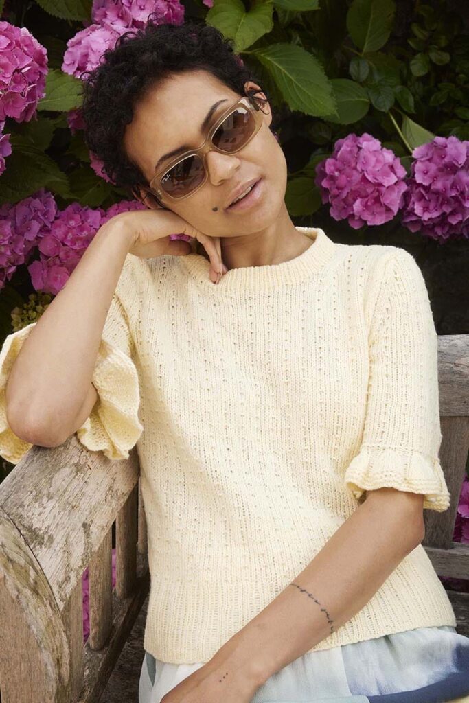 Like the petals of a delicate flower, the ruffle sleeves on this t-shirt add beauty and elegance. Combined with the intricate texture on the body, this design offers a quick and satisfying knitting experience, perfect for those who love to romanticize their knitting life.