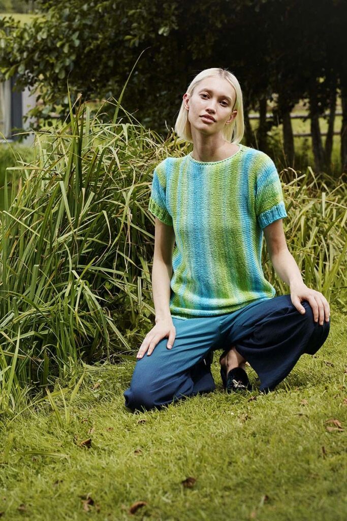 Knit from side to side, the NATURE WALK sweater evokes the serene beauty of walking along a tree-lined path. The multicolored yarn enhances this effect, mimicking the vibrant play of light and shadow through the foliage.