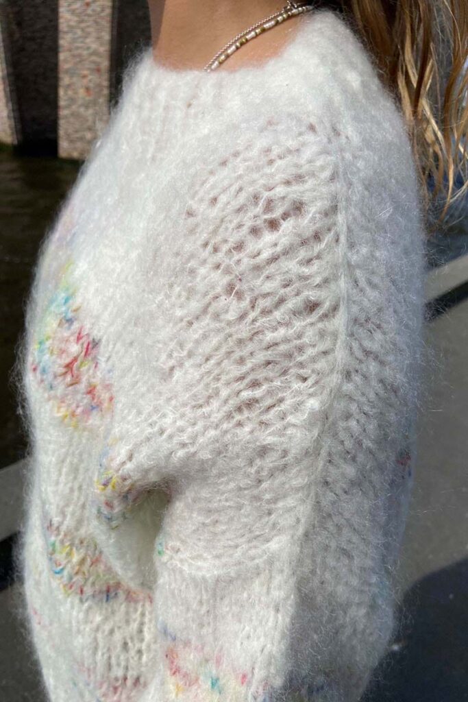 Der CONFETTI-Pullover der dänischen Designerin Sanne Lousdal ist das perfekte Projekt, um diese eine besondere Strange zu verarbeiten, welche für sich allein vielleicht ein wenig zu farbenfroh ist. In Kombination mit dem weichen, flauschigen DESIRE-Garn in Weiß entsteht daraus ein klassischer, tragbarer Pullover mit einem verspielten Twist.