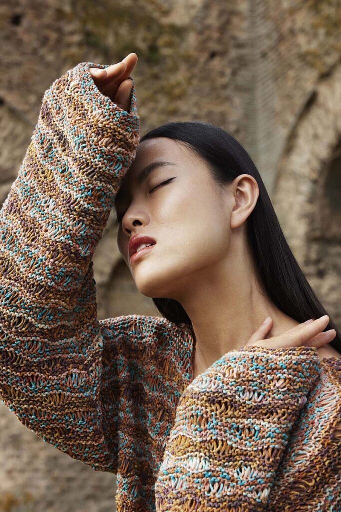 Symbolizing the passage of time, the stitch pattern in the LAYERS OF HISTORY sweater creates an appearance reminiscent of geological layers. This effect is further enhanced by the use of multicolored yarn in the knitting process.