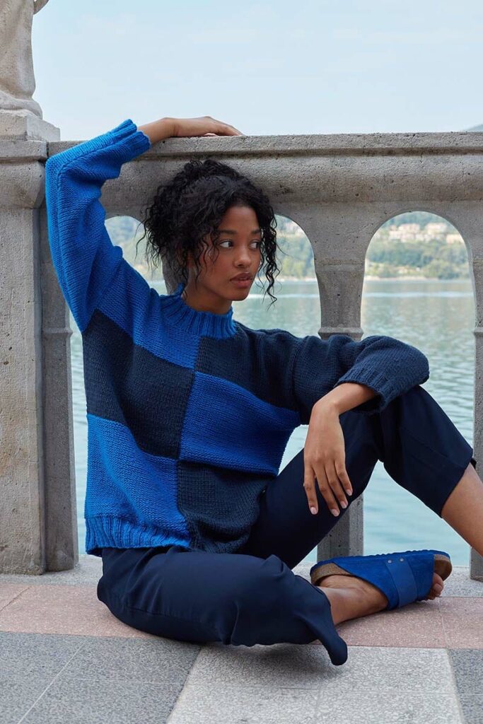 All you need on vacation is vitamin sea. How radiant Marianne is in this photo! This is a classic of ours that does well time and time again. The sweater is made of «HAPPINESS» which makes it wonderfully soft. Get started with the colorblocking theme! Because we have so many different shades available, you can create the most perfect sweater at a glance.