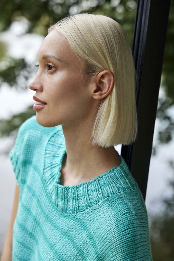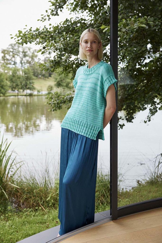 The yarn’s ever-changing opticfrom matte to shiny and shifting shades of bluemirrors the dynamic nature of life itself. The FLOW OF LIFE top beautifully embodies the rhythm of yarn flowing through your fingers as you knit, creating a soothing, meditative experience.