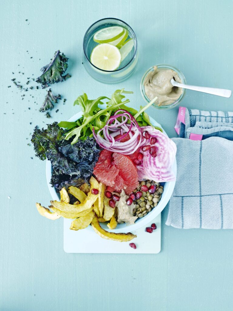 Stiele der Grünkohlblätter entfernen undBlätter in Öl und Salz wenden. Im Ofen bei 150 °C für ca. 20 Min. backen. Zutaten für das Dressing verrühren. Linsen gemäß den Packungsangaben abkochen und abkühlen lassen. Das übrige Obst und Gemüse nach Belieben zurechtschneiden, die Haut der Grapefruit eventuell entfernen. Alles in zwei Schalen anrichten, kurz vor dem Servieren die knusprigen Grünkohlchips darauf geben und alles mit Dressing beträufeln.