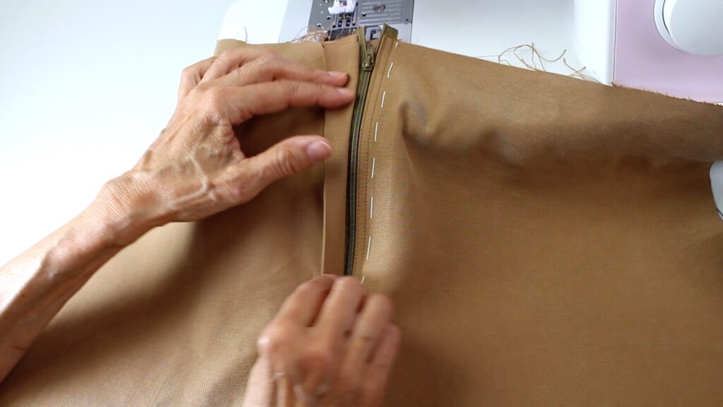 Den Stoff so unter die Maschinen legen, dass die Saumkante mittig unter dem Fuß liegt. So wird beim Nähen die Saumkante verdeckt.