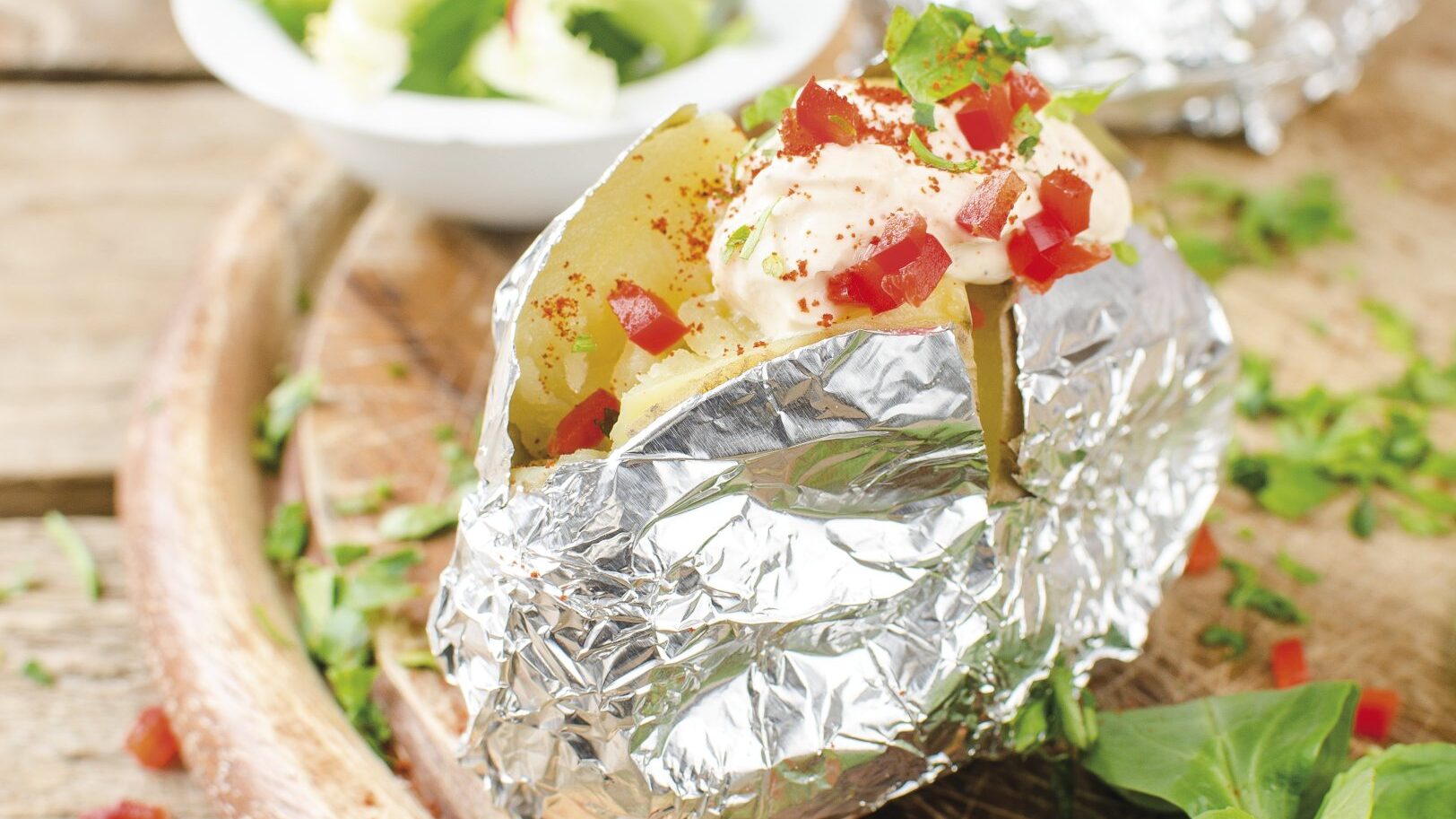 - Kurz vor dem Servieren die heißen Kartoffeln in Alufolie wickeln, mit einem Messer über Kreuz einschneiden, mit zwei Fingern jeweils von außen her zur Mitte hin eindrücken und in die Öffnung etwas Dip füllen.