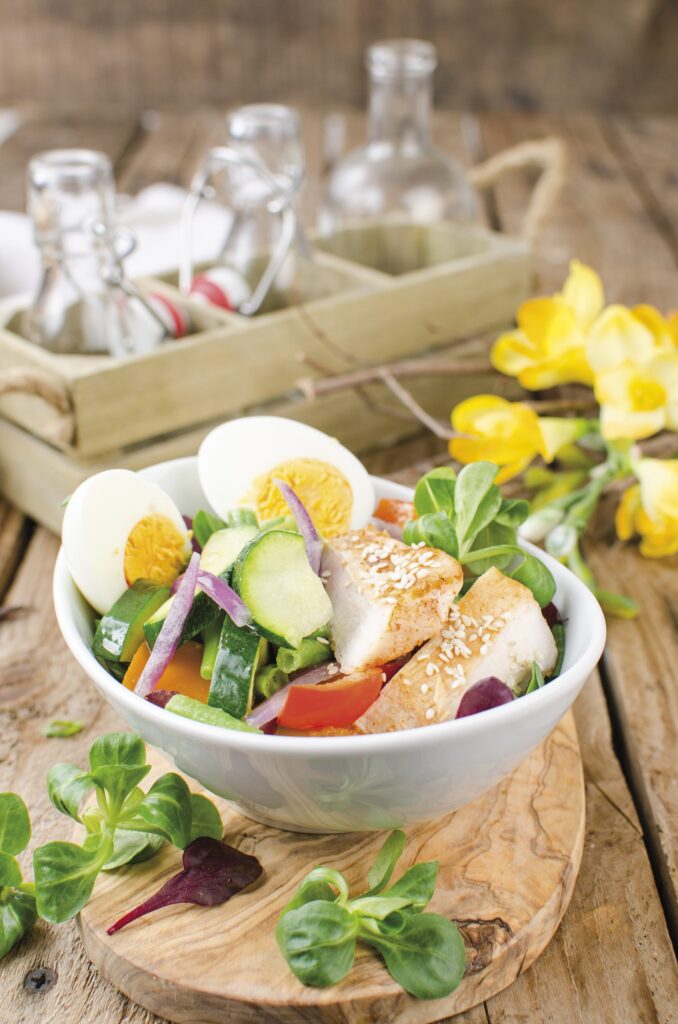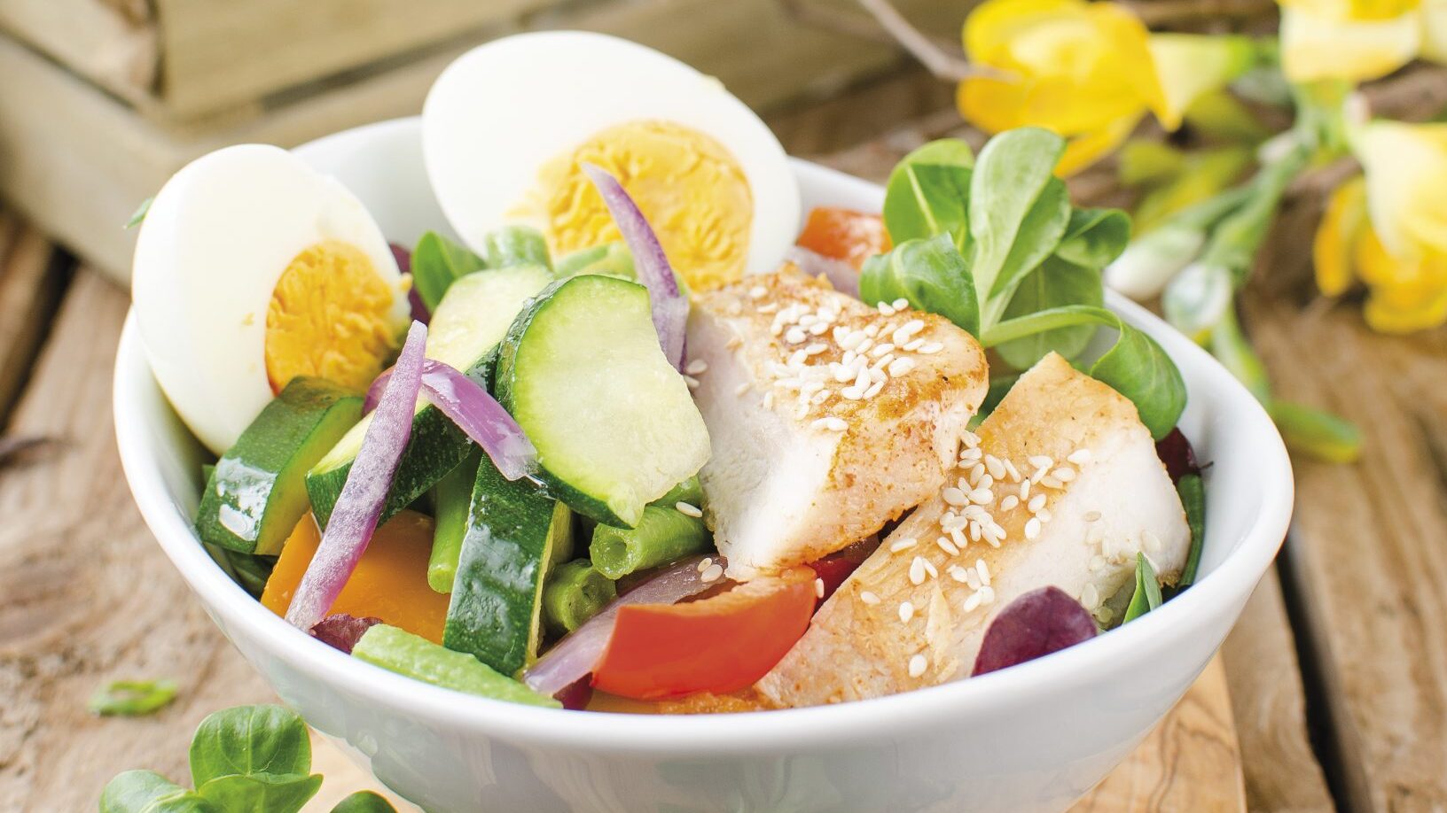 Dieser Salat aus buntem Gemüse, Ei und Hähnchen ist nicht nur ein perfekter Vorspeisensalat, sondern lässt sich auch perfekt für den Lunch im Büro vorbereiten.