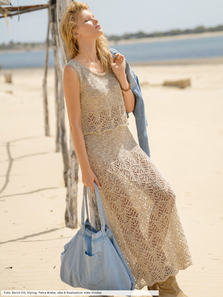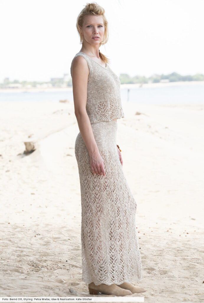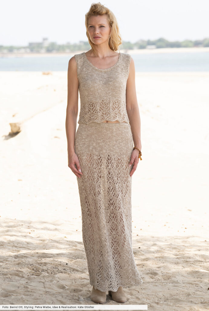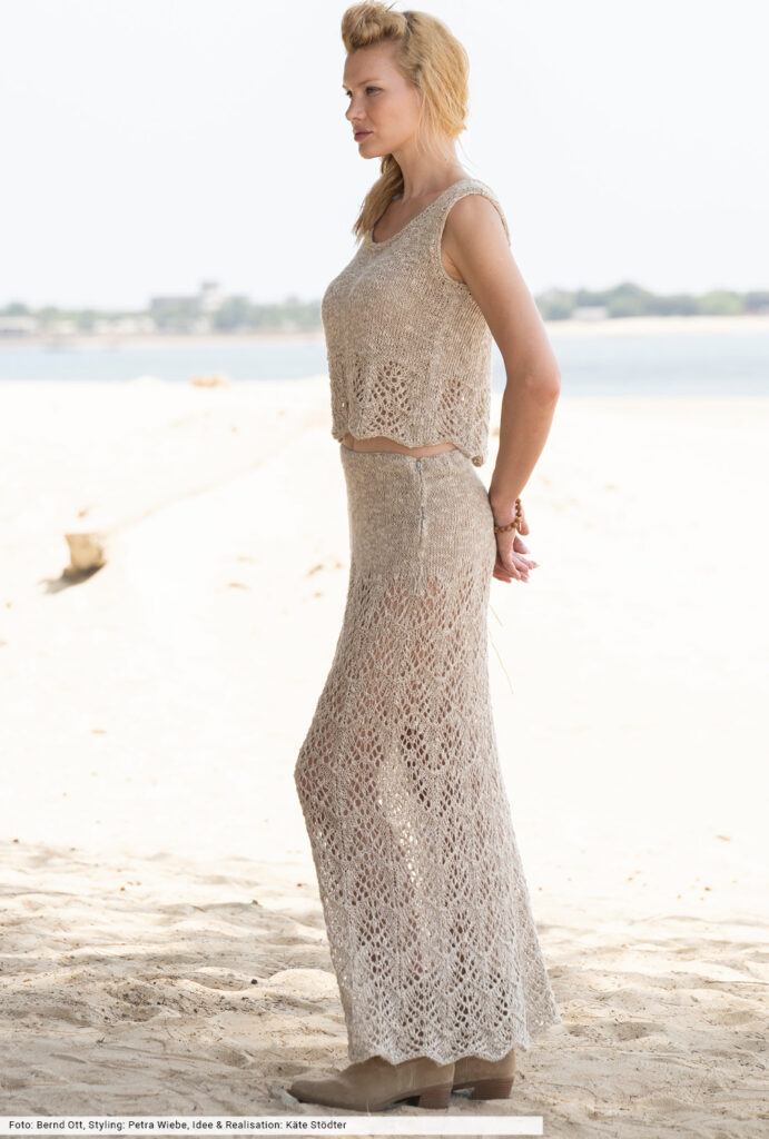 Leinen ist unsere Lieblingsfaser an heißen Tagen. Kein Wunder: Ist sie doch wunderbar kühl, bildet keine Flusen und ist äußerst langlebig. Dieses Ensemble besteht aus kurzem Top, bei dem du mit einer Wellenbordüre beginnst und mit einer breiten Glatt-rechts-Passe endest. Dazu passend gibt es einen schmalem Rock, bei dem das gleiche Wellenmuster allover, aber in Runden gesrickt und oben mit einem Reißverschluss ausgestattet wird. Ein Traumduo, das in neutralem Sand-Ton zum sommerlichen Key-Piece wird.