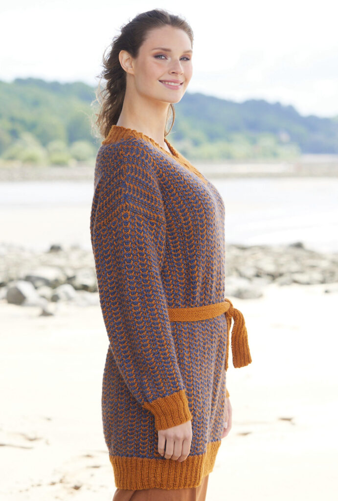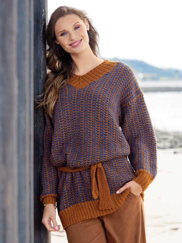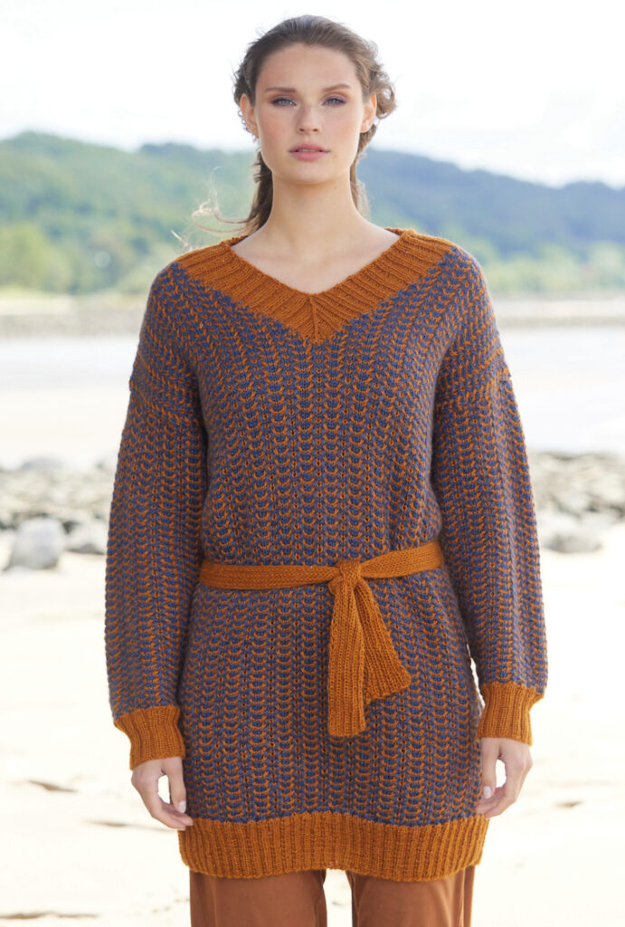 Sabrina Strickjournal Tunika-Kleid oder V-Ausschnitt-Pulli mit Hebemaschenmuster in Kupfer und Dunkelblau