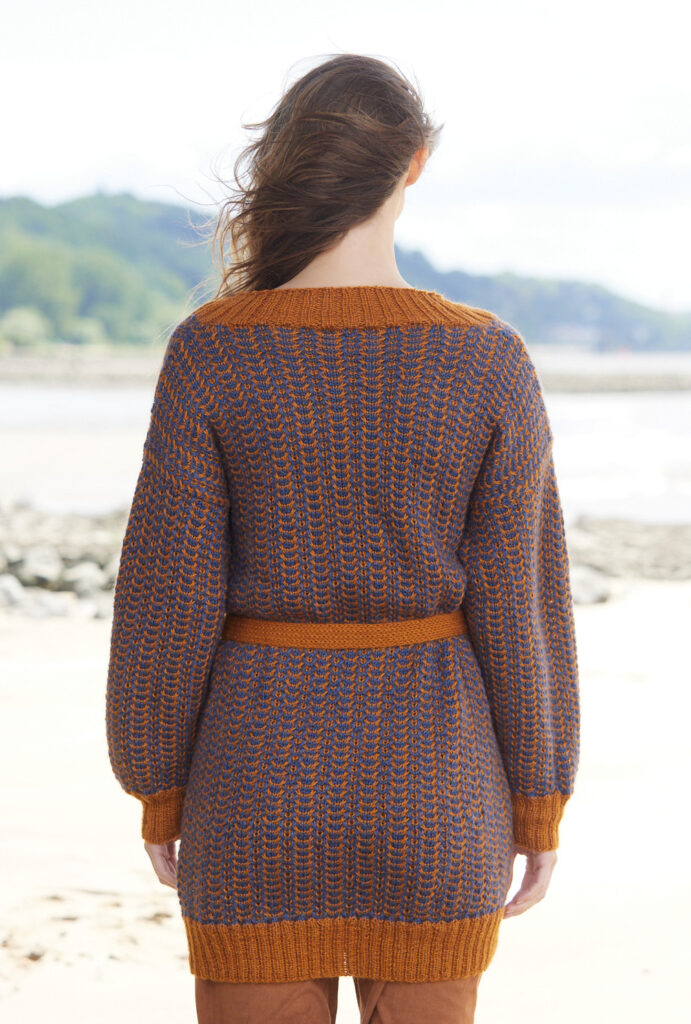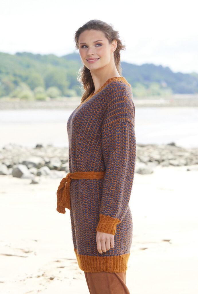 Ob als Kleid oder als Pulli mit dem gestrickten kupferfarbenen Gürtel hochgeschoben und so verkürzt, dieses Modell hat viele Fähigkeiten. Für das interessante verzopfte Hebemaschenmuster werden stets nur zwei Reihen in einer Farbe, entweder Kupfer oder Dunkelblau, gestrickt und die dabei abgehobenen Maschen danach verkreuzt. Die hohen Bündchen und die breite V-Ausschnittblende werden in 2/2-Rippen in Kupfer gearbeitet. Wir empfehlen dafür das edle Garn aus einer Mischung von Mohair, Lamawolle und Seide. Du kannst die Anleitung für den Longpulli bzw. das Kleid in den Größen 38/40, 42/44 und 46/48 downloaden.