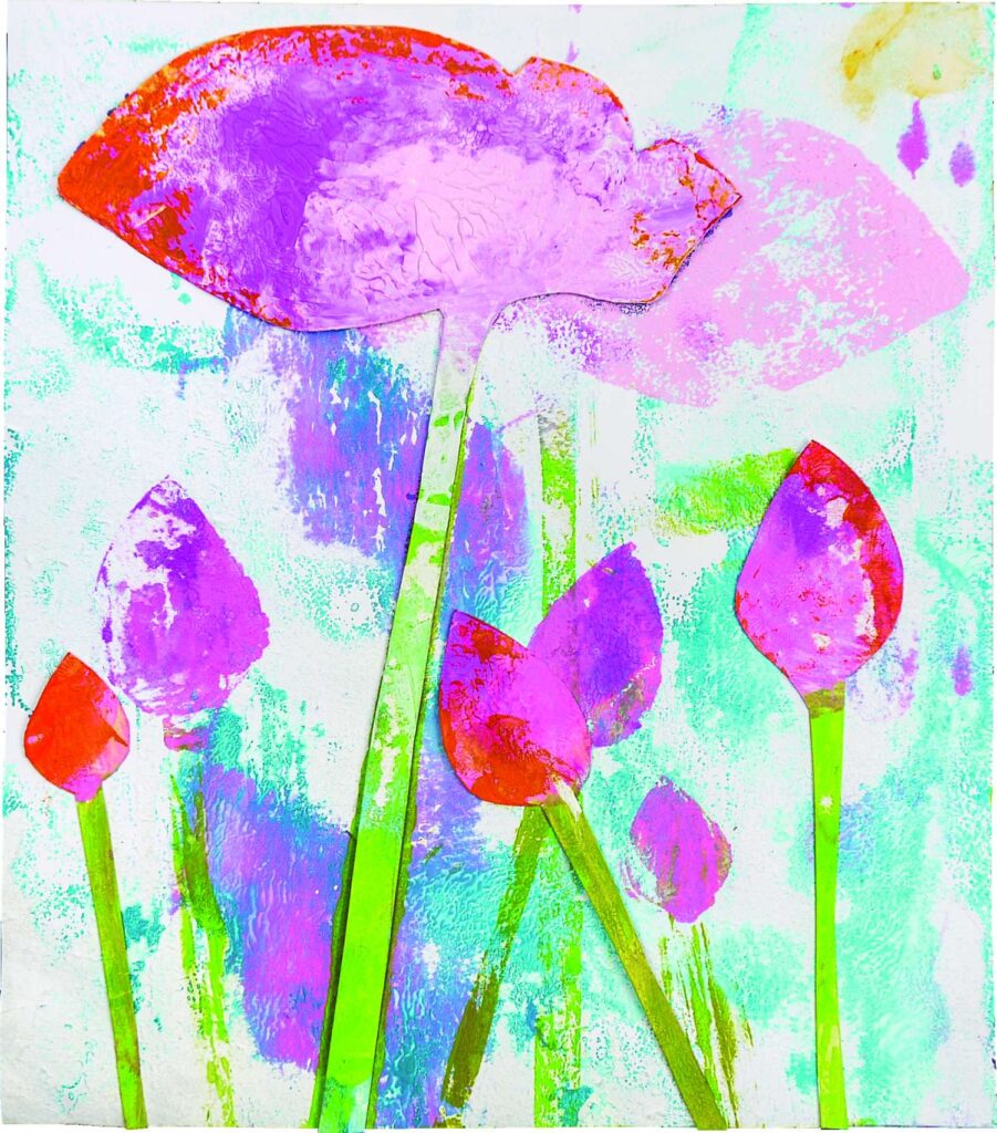 Die fantasievollen Drucke lassen sich wunderbar kombinieren oder weiterbearbeiten. Ihr könnt aus Euren Drucken Blumen ausschneiden und als Collage auf farbig bedruckte Untergrundpapiere kleben, mit selbst gemachten oder fertig gekauften Schablonen arbeiten, Drucke weiter bedrucken etc. Lasst Euch inspirieren und seid kreativ!