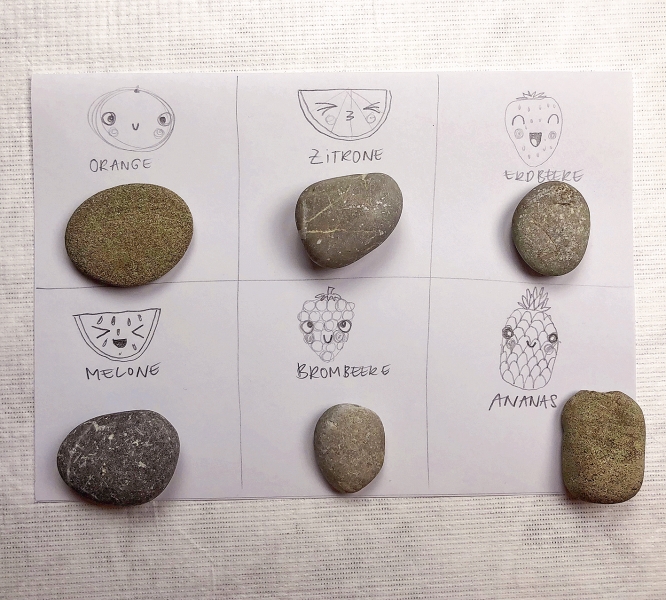 Die Steine gründlich mit Schwamm und Seife von etwaigen Verschmutzungen befreien. Trocknen lassen. Die Steine ihren Umrissformen nach ungefähr den Früchten zuordnen und gegen Verwechslung auf die Rückseite den Anfangsbuchstaben schreiben.