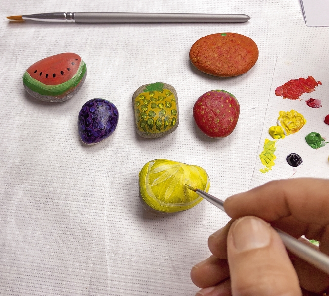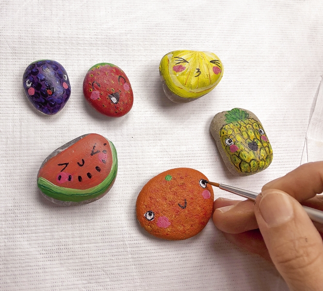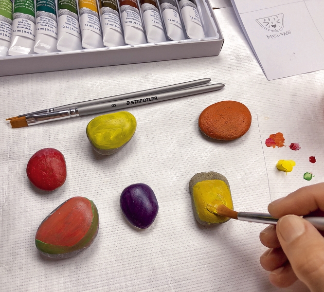 Eine tolle Beschäftigung für einen Nachmittag im Urlaub oder Zuhause für groß und klein ist das Sammeln von Steinen am Wegesrand, am Meer, an Flüssen oder Seen. Die kleinen Handschmeichler können dann zuhause mit Acrylfarben und Permanentstiften niedlich bemalt werden. Lackieren ist nicht nötig, da die Farben nach dem Trocknen grifffest sind. Im Sommer sind als Motiv süße Früchtchen prima. Sie erinnern später dekorativ an den Urlaub.