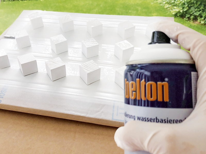 Im Freien eine Fläche großzügig abdecken, um die Würfel und den Objektrahmen besprühen zu können. Die hier verwendete Sprühfarbe ist kinderspielzeugtauglich. Die Dose vor Verwendung mindestens 1 Minute kräftig schütteln. Im Abstand von ca. 20 cm alle Würfel sowie den Objektrahmen gleichmäßig grundieren. Nach 30 Minuten trocknen die Würfel drehen und die restlichen Seiten grundieren. Über Nacht gut trocknen lassen.