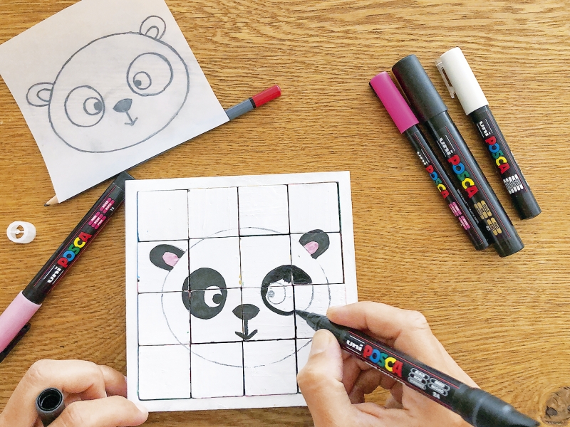 Vor dem ersten Malen die geschlossenen POSCA-Marker gut schütteln. Auf Papier mit der Spitze so lange nach unten drücken, bis der Farbfluss startet. Motiv in den entsprechenden Farben ausmalen.