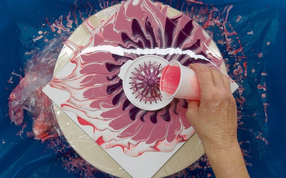 Wem einfaches Gießen zu langweilig ist, der kann mit einer drehbaren Käseplatte verblüffende Effekte zaubern. Darauf wird die Leinwand nach dem Gießen gedreht, wodurch spannende Muster entstehen. Wichtig hierbei: immer nur in eine Richtung drehen und die Käseplatte am besten mit Frischhaltefolie oder ähnlichem vor der Farbe schützen.