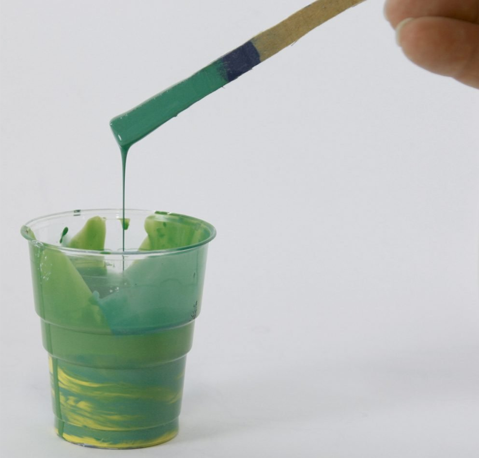 Zunächst braucht Ihr Acrylfarben. Da diese pur zu dickflüssig sind, müssen sie mit einem Pouring Medium gemischt werden. Je nach Mischverhältnis lassen sich unterschiedliche Ergebnisse erzielen. Das Pouring Medium trocknet übrigens transparent glänzend und ist daher auch als Überzugslack für Acrylbilder geeignet.