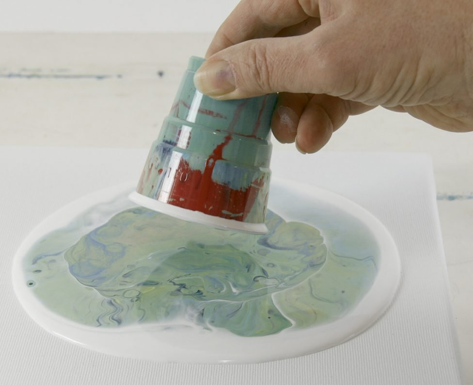 Dazu gibt es einen Trick: Stellt den Becher ab, presst den Keilrahmen mit der Leinwandseite darauf und dreht beides beherzt um. Um den Farbfluss zu verbessern, um den Becher herum mit Pouring Medium gemischte weiße Acrylfarbe gießen. Becher abnehmen und staunen, wie sich die Farben verteilen. Durch Schräghalten der Leinwand oder Durchziehen eines Spachtels ergeben sich spannende Muster.