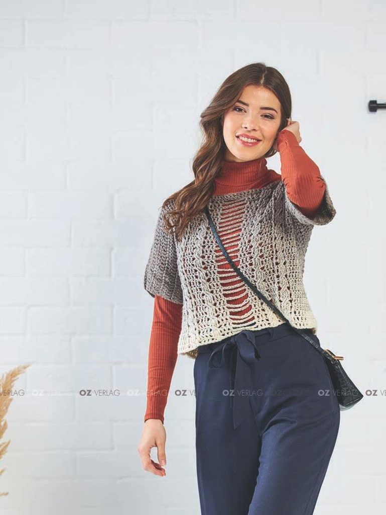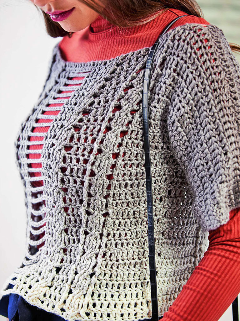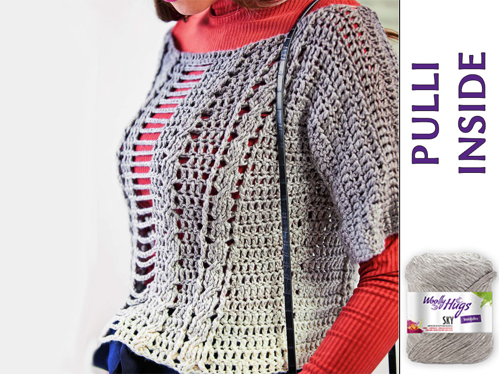 Dieser kleine leichte Überzieherpulli peppt jedes Outfit auf und ist gleichzeitig der Beweis dafür, das Häkelmode weder langweilig noch altbacken sein muss. Perfekt ist er zum Überziehen geeignet, aber auch im Layering-Look mit schleichten Tops ist er im Sommer ein Hingucker. Das besondere Designelement am Vorderteil und Rücken sorgt für das gewisse Etwas – einerseits verspielt, aber auch ein bisschen sexy. Der Farbverlauf ist von Weiß nach Grau. Jedes Knäuel des Garns fängt mit der hellen Farbe an und endet mit dem dunkleren Ton. So kann man den Farbverlauf in jedem Strickstück gut planen. Wer etwas mehr Farbe möchte, kann sich eine der anderen tollen Farben der Woolly Hugs SKY aussuchen.