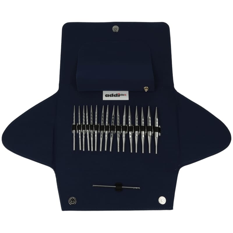 Die ergonomischen addiNovel Feinstricknadeln mit viereckig abgerundeten Kanten und einer strukturierten Oberfläche gibt es auch als addiClick Etuis zum Wechseln. Die Etuis gibt es in zwei blauen Textil-Strukturen. Verfügbar in einer Lace Long und einer Lace Short-Variante. Beide enthalten NadelPaare von 3,58,0 mm. Im Lace Short-Etui befinden sich 5 rote addi-Seile in den Längen 40, 50, 60, 80 und 100 cm. Das Lace Long-Etui beinhaltet 3 addi-SOS-Seile in 60, 80 und 100 cm. 1 Kupplung, 1 addi-Goldbrosche und 1 addiGrip für das leichte Greifen der Spitzen und Seile sind in beiden Etuis enthaltennatürlich Made in Germany.